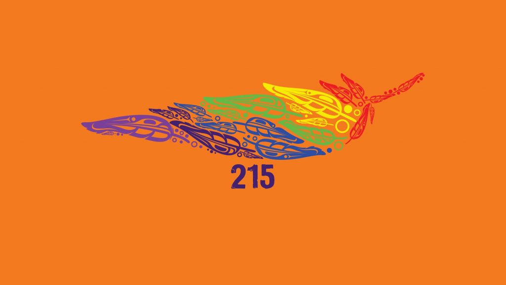 The featured feather design was created by Carey Newman Hayalthkin’geme (Kwakwaka’wakw/Coast Salish) for Orange Shirt Day in 2017. The design—a grouping of smaller feathers to create a larger one—is meant to represent that children come in all shapes and sizes, and they’re all important. In 2019, Newman incorporated the rainbow colours as a way for the design to be more inclusive of LGBTQ2S+ peoples. Newman is also the creator of the Witness Blanket, a 12-metre-long sculpture comprised of 600 objects and artifacts he collected from Indian residential schools across Canada.