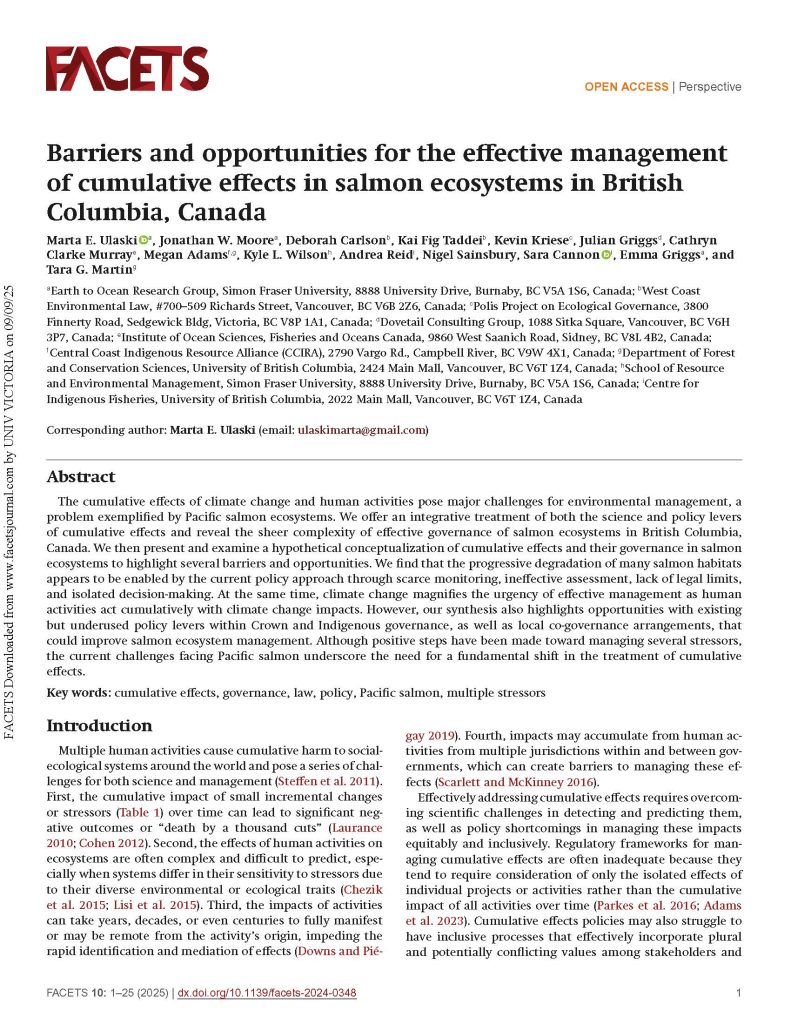 Ulaski, M., Moore, J.W., Carlson, D., Taddei, K.F., Kriese, K., Griggs, J., Clarke Murray, C., Adams, M., Wilson, K.L., Reid, A., Sainsbury, N., Cannon, S., Griggs, E., & Martin, T.G. (2025, September). Barriers and opportunities for the effective management of cumulative effects in salmon ecosystems in British Columbia, Canada, FACETS 2025 10: 1-25. DOI: https://doi.org/10.1139/facets-2024-0348