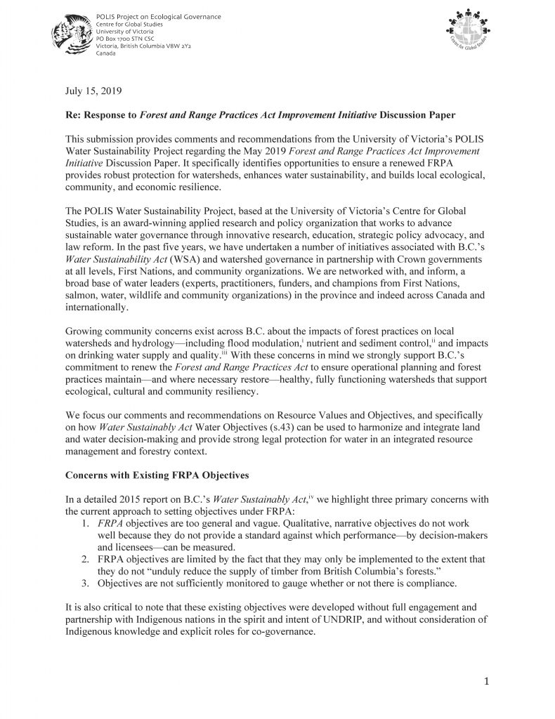 This submission provides comments and recommendations from the University of Victoria’s POLIS Water Sustainability Project regarding the May 2019 Forest and Range Practices Act (FRPA) Improvement Initiative Discussion Paper. It specifically identifies opportunities to ensure a renewed FRPA provides robust protection for watersheds, enhances water sustainability, and builds local ecological, community, and economic resilience.