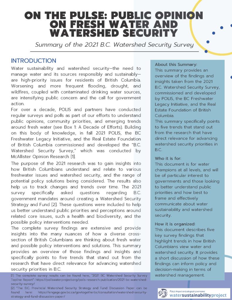 This summary provides an overview of the findings and insights taken from the 2021 B.C. Watershed Security Survey, which was commissioned and developed by POLIS, the BC Freshwater Legacy Initiative, and the Real Estate Foundation of British Columbia. This summary specifically points to five trends that stand out from the research that have direct relevance for advancing watershed security priorities in B.C.